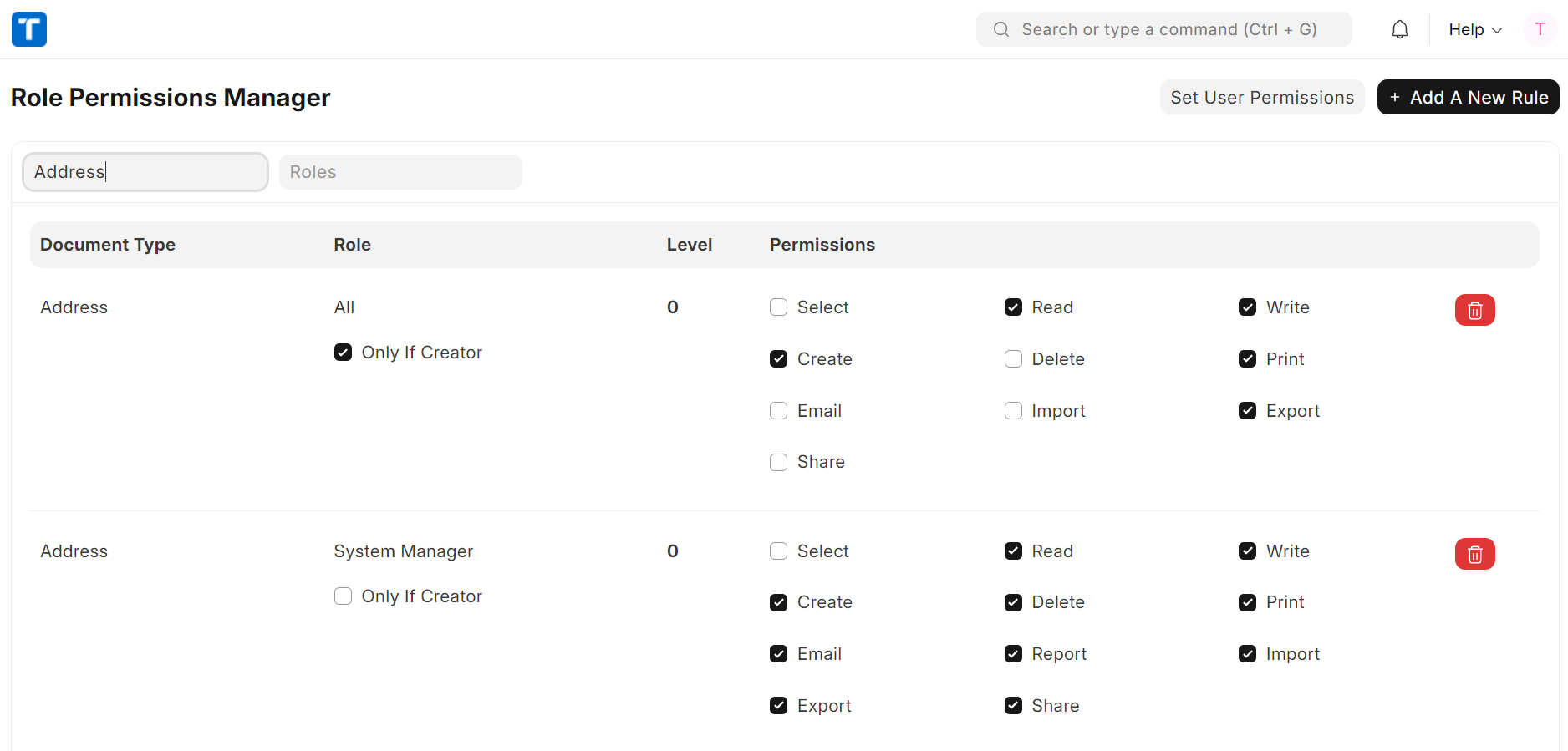 User > User Permissions, limit users to specific records based on the document type and their role.Field Access Control: Higher permission levels allow for nuanced field access, useful for hiding fields or making them read-only.